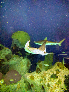 The aquarium is a beautiful place to visit. I enjoyed walking the spiral path where you can see all kinds of fish and other water animals. It seems we were there at feeding time. I found it amusing to watch the divers swimming around together with the fish in the great tank!